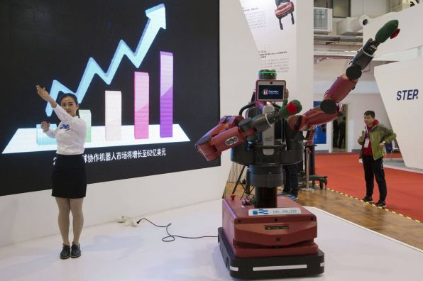 图为去年10月在北京举行的世界机器人大会上,工作人员在展示工业机器人的性能。(美联社资料图片)